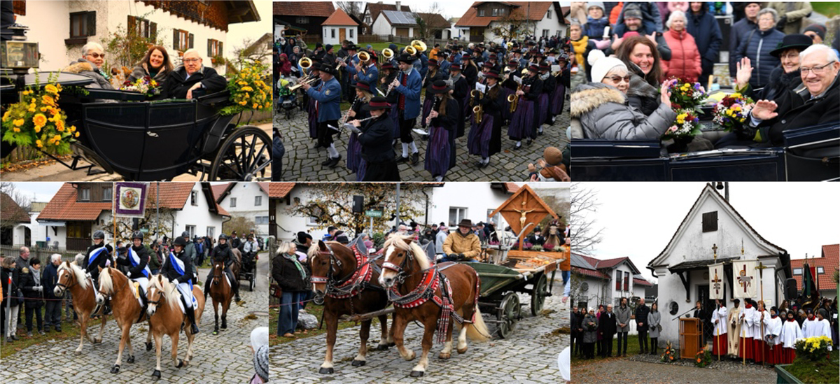 Der Leonhardiritt in Illerbeuren war ein besonderes Ereignis. Die Fotos von Franz Kustermann zeigen (oben/von links) in der Kutsche (v.l.) Elisabeth Miller, Kreisbäuerin Irmgard Maier und Landwirtschaftsminister a. D. Josef Miller, die heimische Musikkapelle beim Umzug sowie in der Kutsche (v.l.) Elisabeth Miller, Kreisbäuerin Irmgard Maier, Kreisbäuerin a.D. Margot Walser und Landwirtschaftsminister a.D. Josef Miller. Die untere Bildreihe zeigt (v.l.) ein Dreiergespann mit Standarte sowie daneben Zweispänner mit prächtigem Geschirr. Das Foto unten rechts entstand bei der Leonhardskapelle und zeigt (v.l.) Elisabeth Miller, Staatsminister a.D. Josef Miller, Bundestagsabgeordneter Florian Dorn, Bezirkstagspräsident Michael Sailer, Landrats-Kandidatin Verena Winter (CSU), Pfarrer mit Ministranten und am Rednerpult Frau Zehnpfennig-Wöhrle aus Illerbeuren.